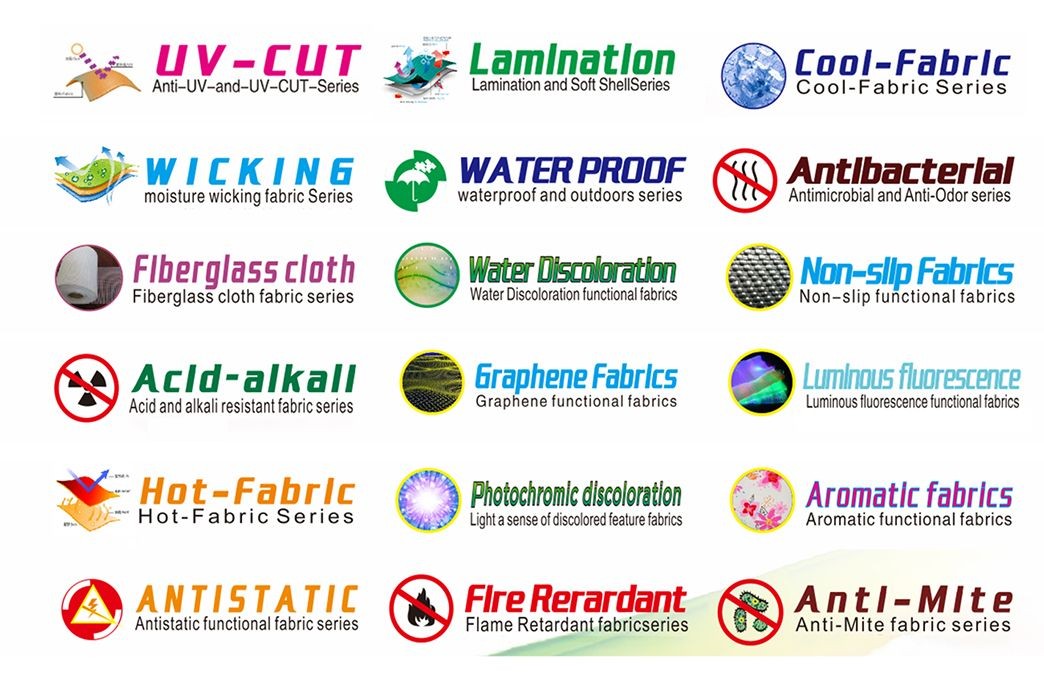 Fire-retardant, moisture absorption and perspiration, waterproof and oil-proof, breathable and moisture-permeable, antistatic, antibacterial and mildew-removing, heat-sensitive, cool-sensitive, light-changing, temperature-changing, rainwater color-changing, radiation-proof, acid-proof and alkali-proof, anti-UV, mosquito-proof, aromatic, reflective luminous, fluorescent, graphene, non-slip, outdoor soft shell